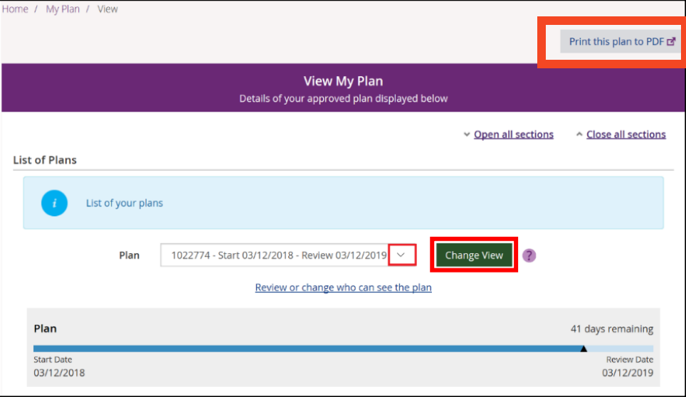 At the top right of the page, click ‘Print this plan to PDF’. Your plan will open in a new tab or window and can be saved or printed from there.